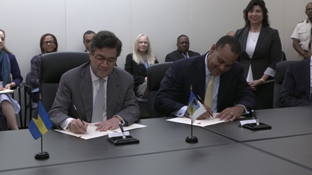 NASSAU, The Bahamas — Minister of State for Finance the Hon. Michael Halkitis (right) joins President of the Inter-American Development Bank Mr. Luis Alberto Moreno in signing a ceremonial document on April 7, 2016, at the Baha Mar Convention Centre. The document represented the approved loans for Public Financial Management and Performance Monitoring Reform; Citizen Security and Justice; Support for the Design of a Community Re-Entry System for Former Offenders and Support for the Development of a National Airlift Diversification Plan projects. (Photo Courtesy: IDB Arlette Pedraglio)