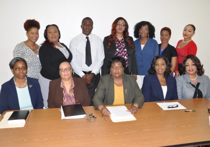 Shown seated during the press conference from left are: Patrice Mack, Chief Welfare Office; Dorothea Gomez, Chief Welfare Officer; Paula Marshall, Assistant Director; Fran Brice, Chief Welfare Officer; and Rochelle Minnis, Senior Welfare Officer. (BIS Photo/Vandyke Hepburn)