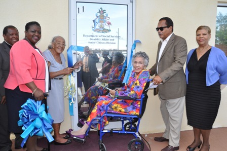 | As a part of the official opening of the Department of Social Services Disability Affairs and Senior Citizens Divisions of the Ministry of Social Services and Community Development on Friday, May 13, 2016 there was a ribbon cutting ceremony. Shown from left are: Pastor Peter Pinder, president, Grand Bahama Christian Council; the Hon. Melanie Griffin, Minister of Social Services and Community Development; Ms. Jacqueline Bowe, a 95-year-old resident of Holmes Rock, West Grand Bahama; Lady Laurie Miller; Russell Miller, son of Lady Laurie; and Mrs. Lillian Quant-Forbes, Senior Deputy Director, Ministry of Social Services and Community Development. (BIS Photo/Vandyke Hepburn) |